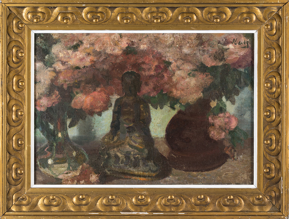 Lotto 297 | Vaso di fiori con Buddha, olio su tela, cm 40x60 firmato in alto a destra J...