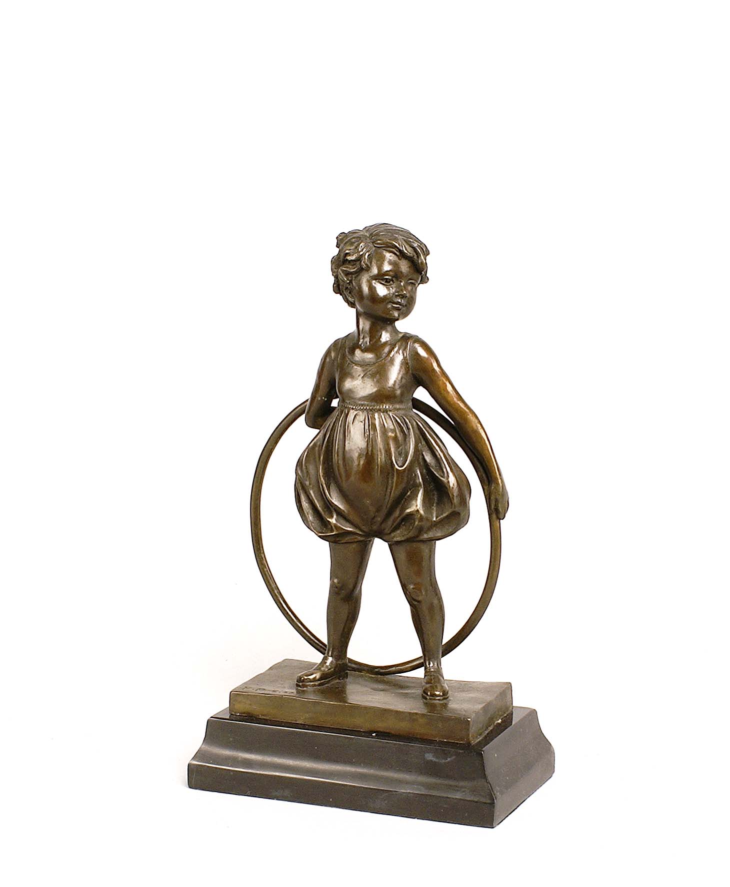 Ferdinand Preiss (Germania 1882 - 1943), copia da, "Bambina con cerchio", gruppo in bronzo patinato, poggiante su base rettangolare in marmo nero, h. cm. 30.