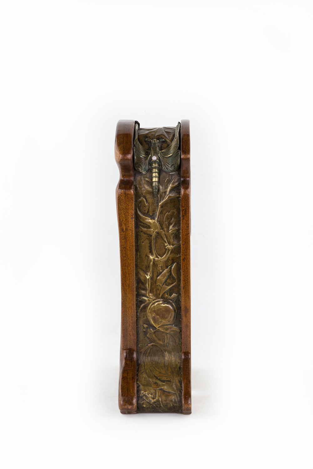 Orologio liberty attribuito a Louis Majorelle circa 1915 L'orologio evidenzia la silhouette e gli stilemi peculiari dello stile dell'autore, comprese le due libellule contrapposte poste sui lati superiori della pendola. La cassa è realizzato in legno di faggio, mentre il rivestimento è realizzato in rame sbalzato con decori floreali in rilievo e con inserti in vetro colorato sul fronte. Il quadrante dell'orologio è anch'esso in rilievo, con una carica di otto giorni. Un orologio simile è pubblicato su Liberty - Art Nouveau di Lara V. Masini. Editore Giunti. Louis Majorelle, (26 settembre 1859 - 15 gennaio 1926) è stato un famoso decoratore e mobili di design francese che ha prodotto i suoi propri disegni, nella tradizione francese del ébéniste. È stato uno dei più importanti designer di mobili e oggetti in stile Art Nouveau e dopo il 1901 ha ricoperto la carica di vicepresidente del Beaux-Arts. Nel 1901, Majorelle divenne uno dei membri fondatori della Scuola di Nancy, conosciuta anche come l'Alleanza Provinciale des Industrie d'Arte, costituita da un gruppo di artisti, architetti, critici d'arte, e industriali in Lorena che decisero di lavorare in modo collaborativo, e prevalentemente in stile Art Nouveau. Misure: cm 43x23x11