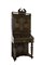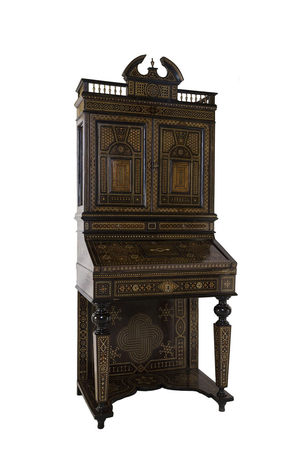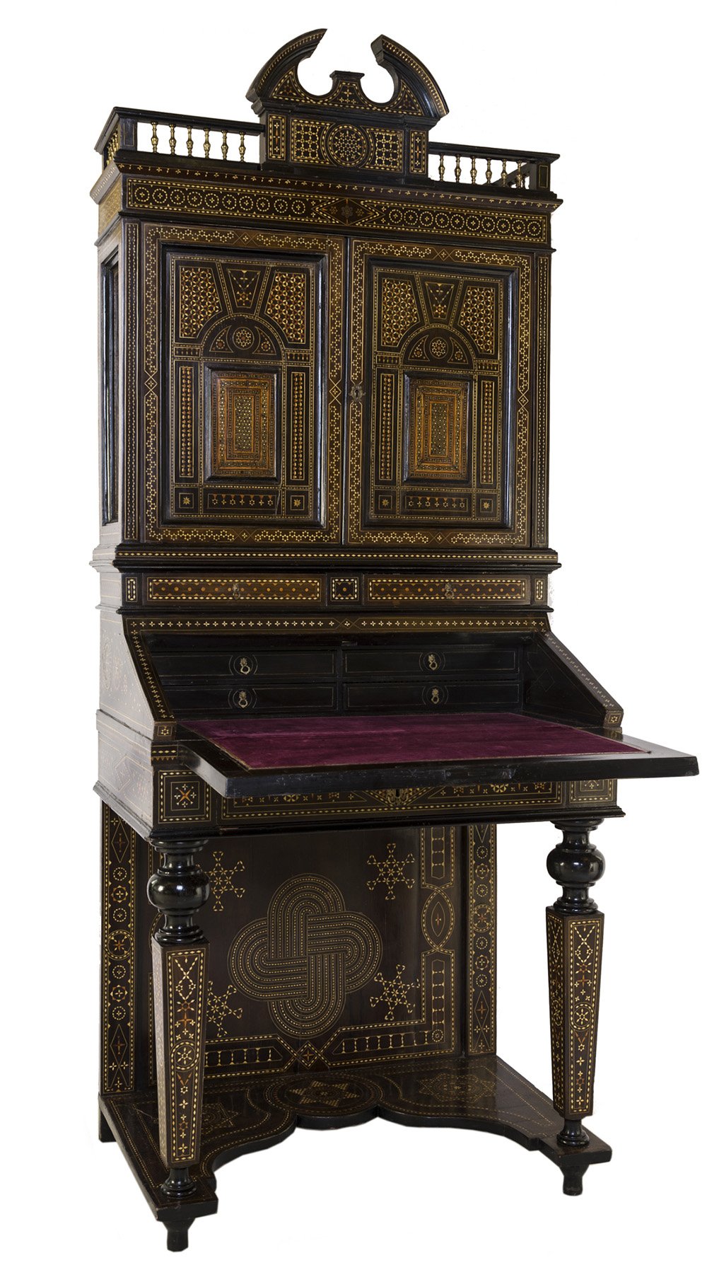 Scrittoio a ribalta con alzata con fitta decorazione a tarsie geometriche "alla Certosina" in avorio e legni pregiati. Corpo superiore di impostazione architettonica rifinito da timpano spezzato e da ringhiera, con due sportelli e due cassetti allineati; quattro tiretti all'interno della calatoia ed un cassetto nella fascia; sostegni anteriori ad obelisco capovolto con attacchi torniti. Lombardia, XIX secolo, cm 88x215x57