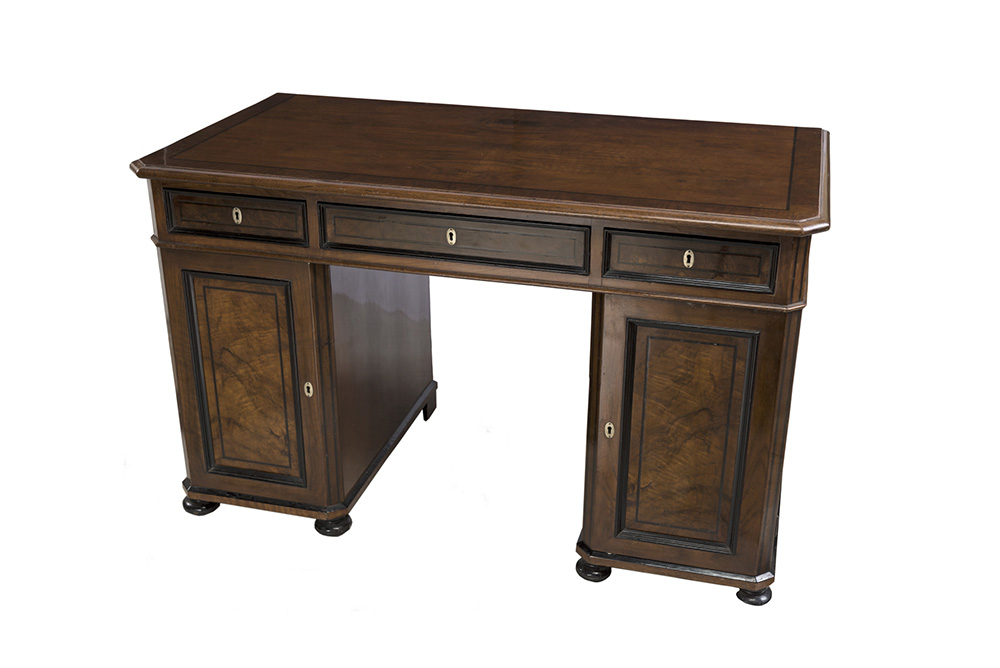 Scrivania a bancone da centro in noce con profili e filettature in legno ebanizzato; tre cassetti in linea nella fascia e due sportelli laterali, piedi a plinto. Cm 72 x 132 x 68