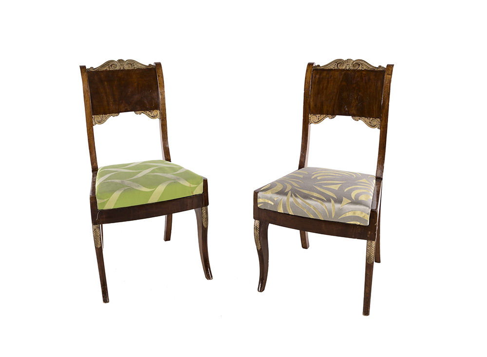 Coppia di sedie in mogano, con schienali a giorno e spalliera idealmente sostenuta da volute intagliate e dorate, elemento decorativo ripreso sulla sommità; sedili imbottiti, gambe sagomate di linea sfuggente, decorate all'attaccatura da rilievi dorati. Austria XIX secolo, cm 91x48x40