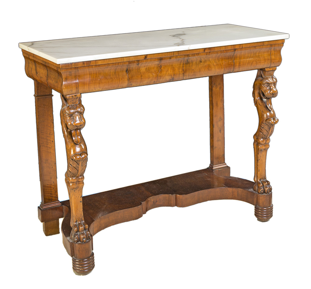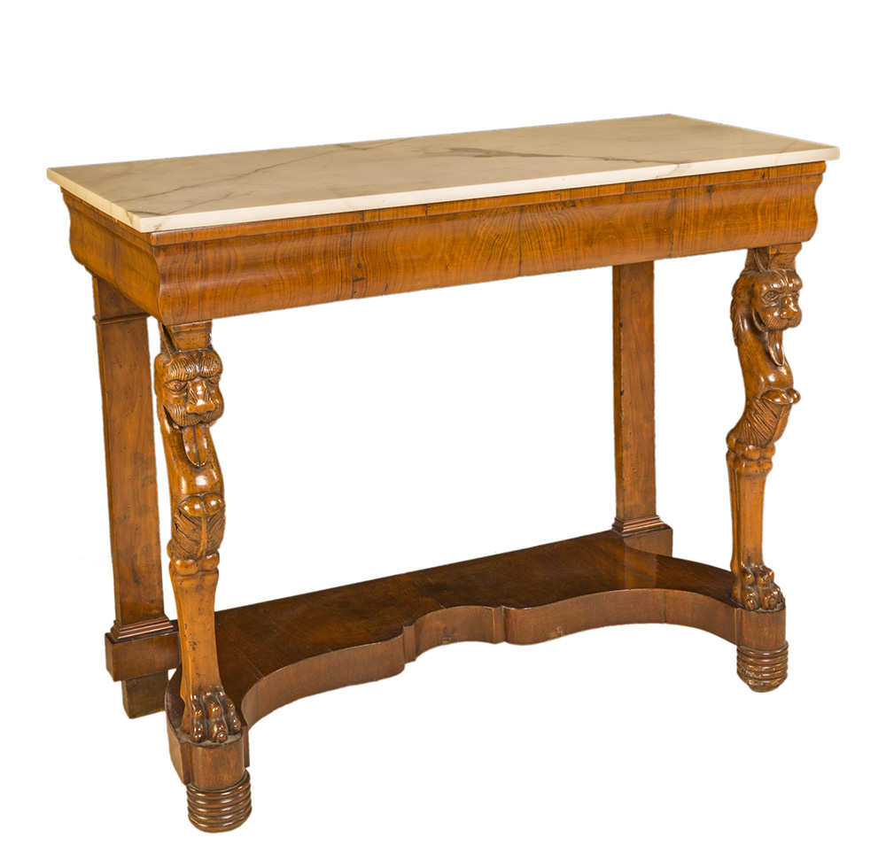 Coppia di consoles in noce, con piano rettangolare in marmo bianco, fascia lineare lievemente sagomata, montanti anteriori scolpiti a figura ferina, posteriori a lesena. XIX secolo, cm 93 x 115 x 50