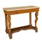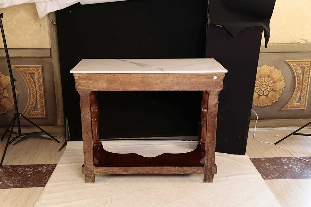 Coppia di consoles in noce, con piano rettangolare in marmo bianco, fascia...