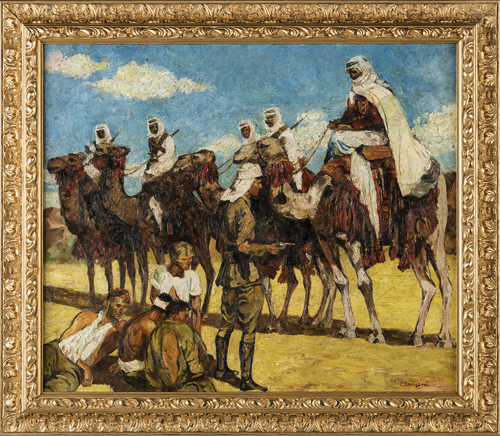 Incontro nel deserto tra soldati e beduini, firmato in basso a destra, olio su tela cm 49x57
