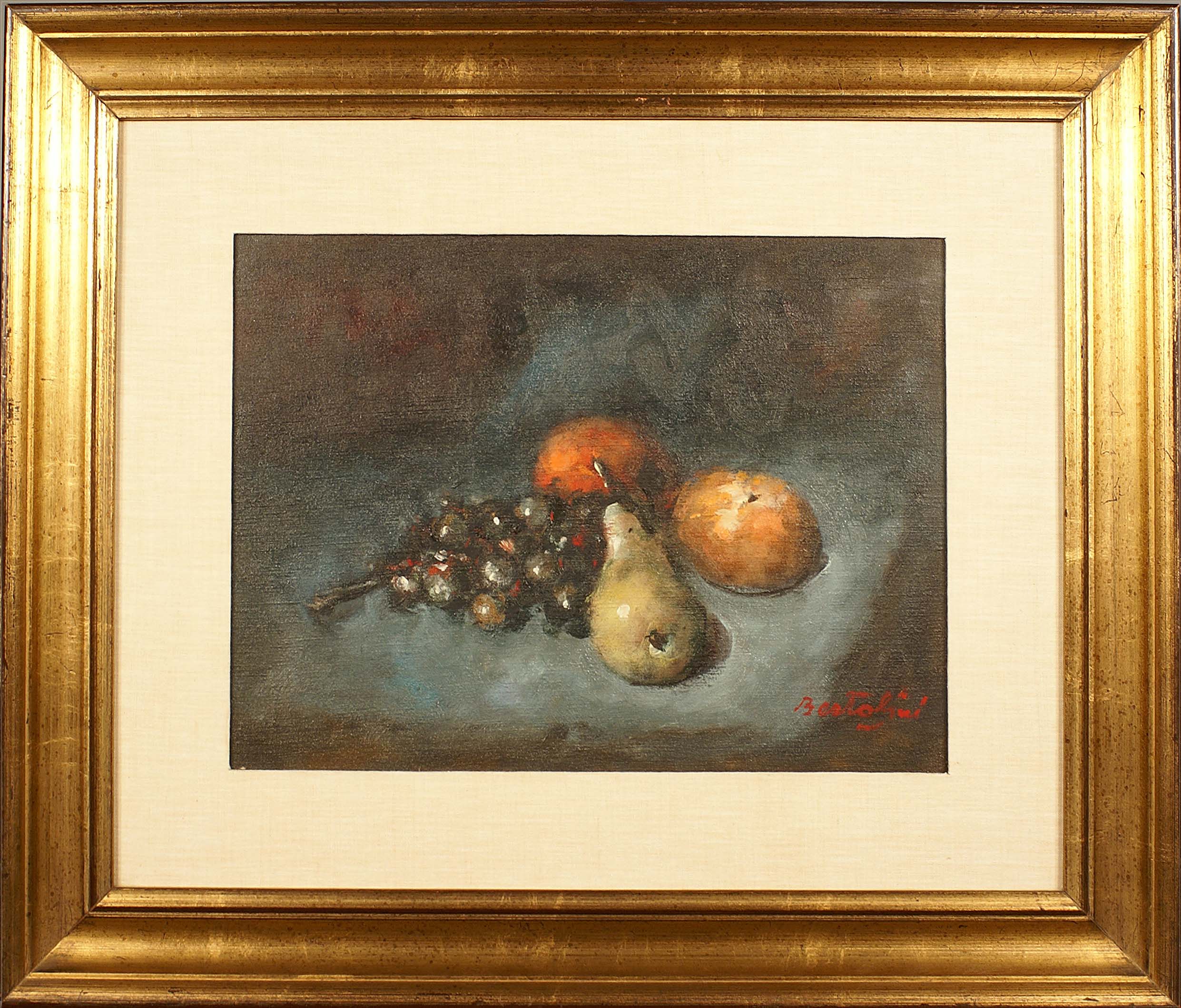 Giusepe Bertolini (Roma 1939), "Pera, uva e mandarino", olio su tela, cm. 30x40, firmato in basso a destra, titolo, firma e anno 1968 sul retro.