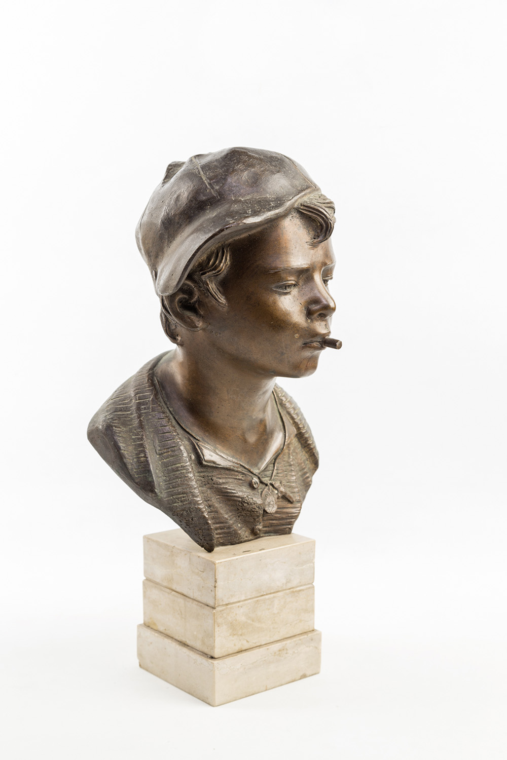 Scultura in bronzo con un giovane che fuma, cm 34 base in marmo chiaro cm...