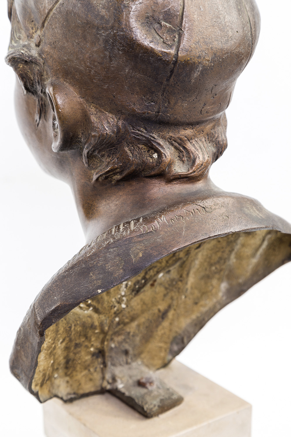 Scultura in bronzo con un giovane che fuma, cm 34 base in marmo chiaro cm 12x11x11 firmato sulle spalle De Martino