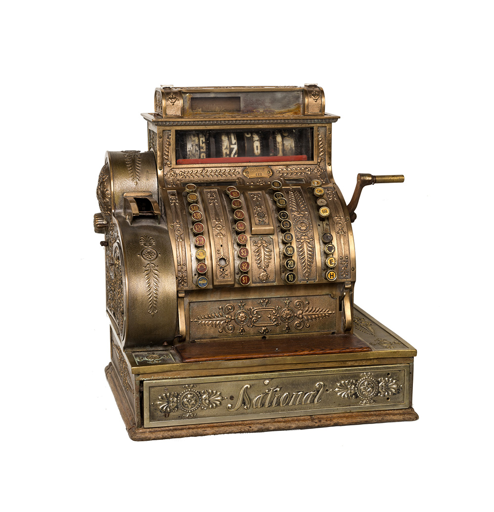 Registratore di cassa meccanico rivestito in ottone con decori floreali. Marca National. Fine XIX/inizi XX secolo, cm 52 x 47 x 40