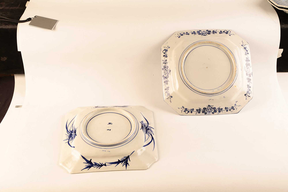 Lotto di due piatti da portata in ceramica smaltata, cm 30x30 e uno cm 28x28. Periodo Edo (1614 - 1867)