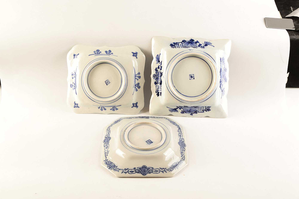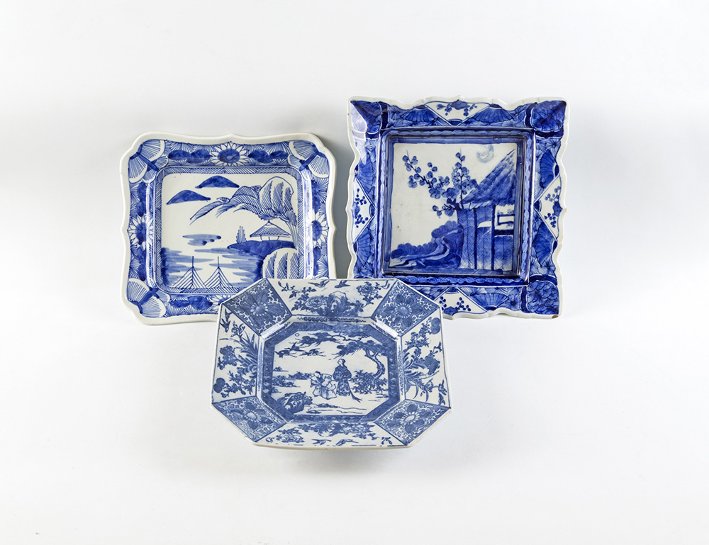 Lotto di tre piatti da portata in ceramica smaltata, di forma diversa cm 21x23,5, cm 24x24 e cm 24x25. Periodo Edo (1614 - 1867)