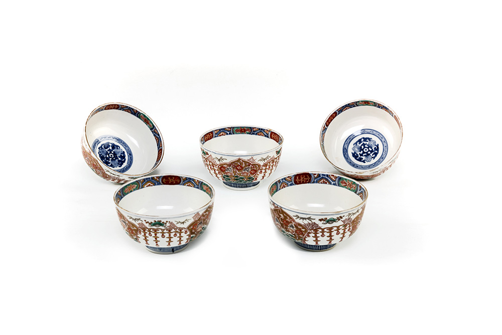 Servizio di cinque tazze in ceramica Imari, cm 12. Fine Periodo Edo (1614 - 1867)