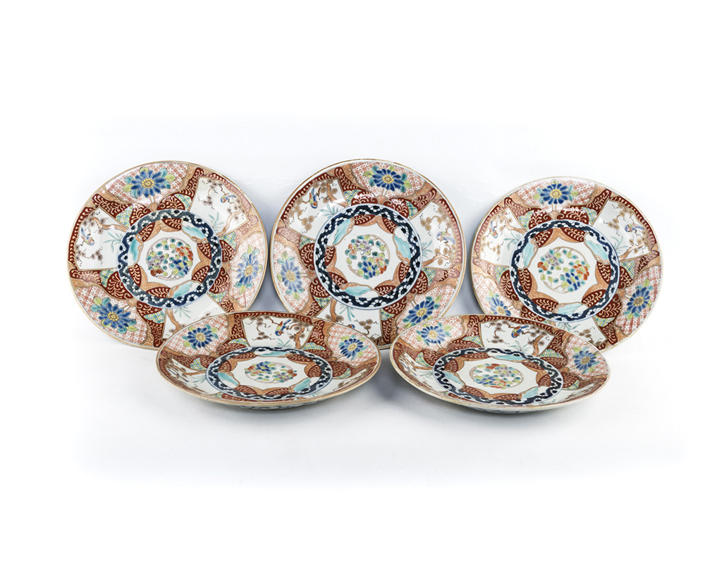 Servizio di cinque piatti in ceramica Imari. Diametro cm 21,5 Periodo Medio...