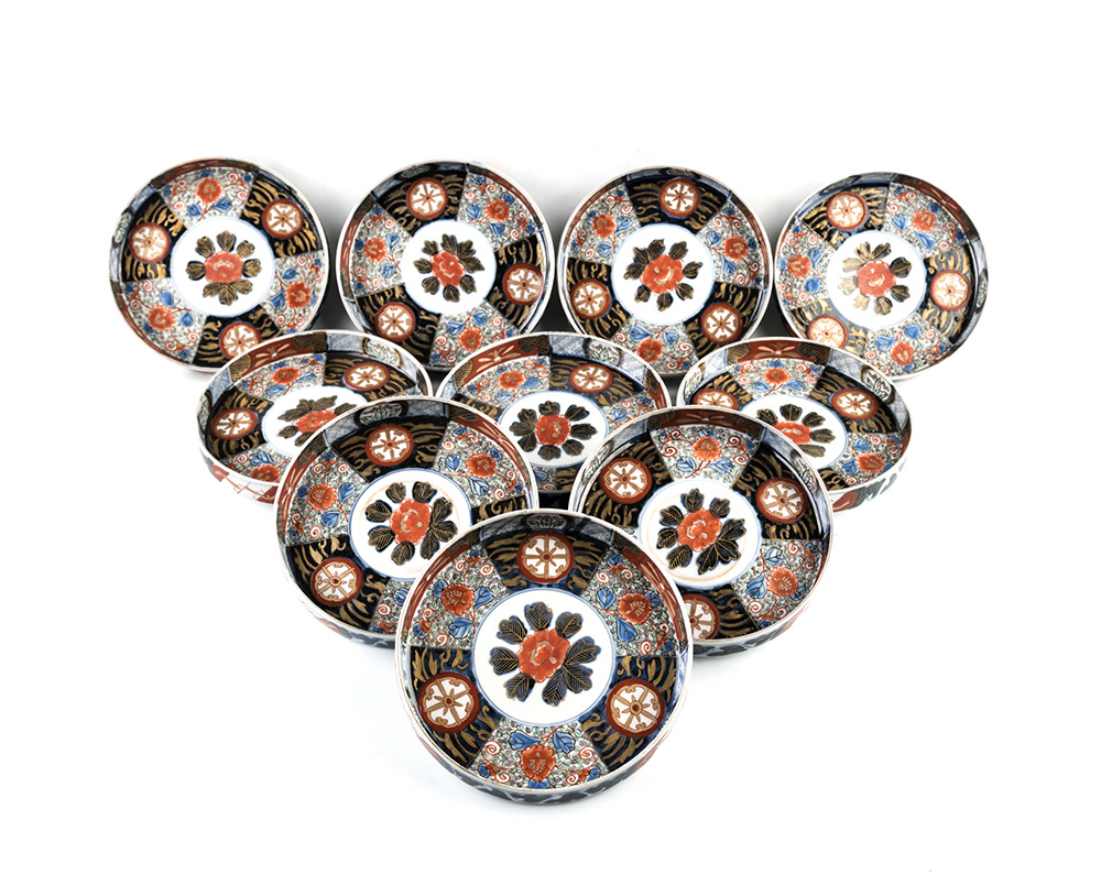Servizio di dieci piatti in ceramica Imari. Diametro cm 15. Periodo Edo (1614...