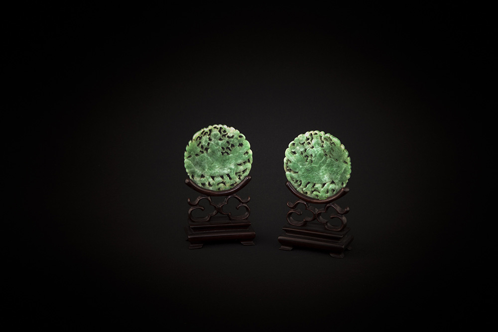 Due dischi in giada imperiale verde, Cina XX secolo, diametro cm 5,2