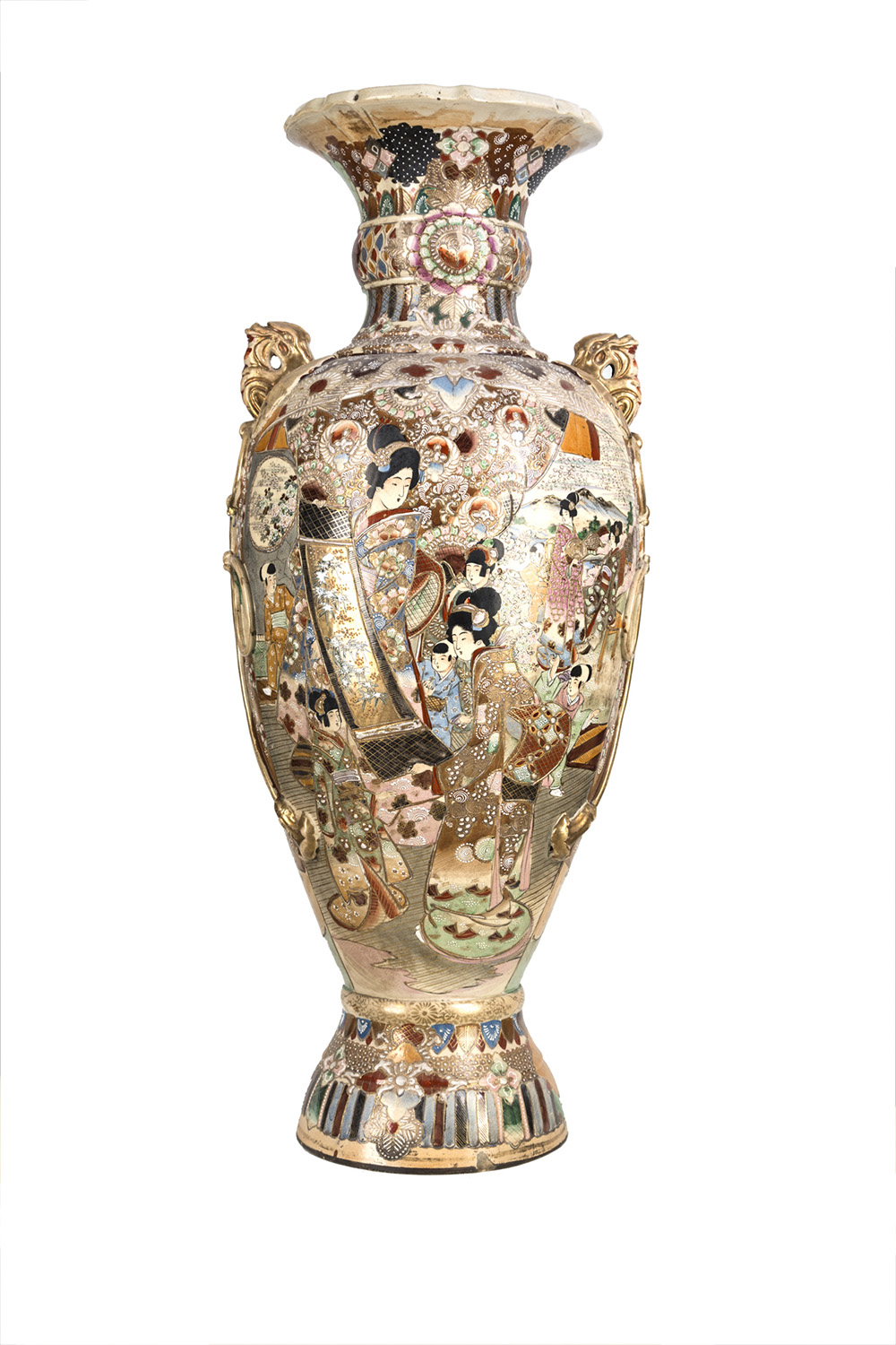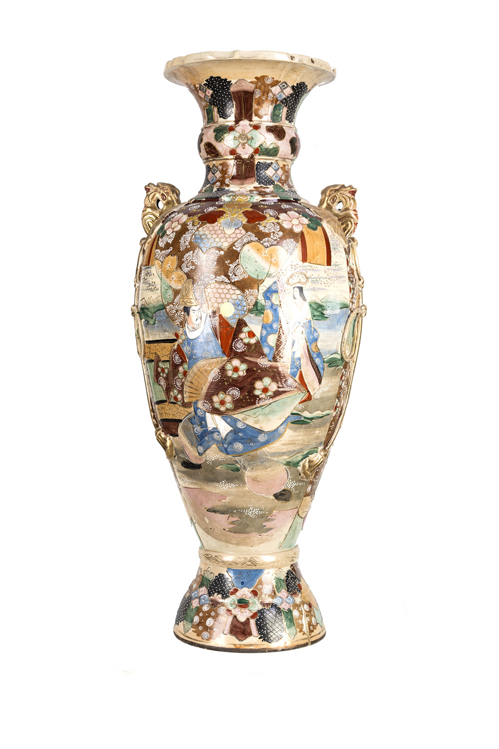 Lotto 487 | Coppia di grandi vasi Satsuma in maiolica dipinta, con corpo a balaustro...