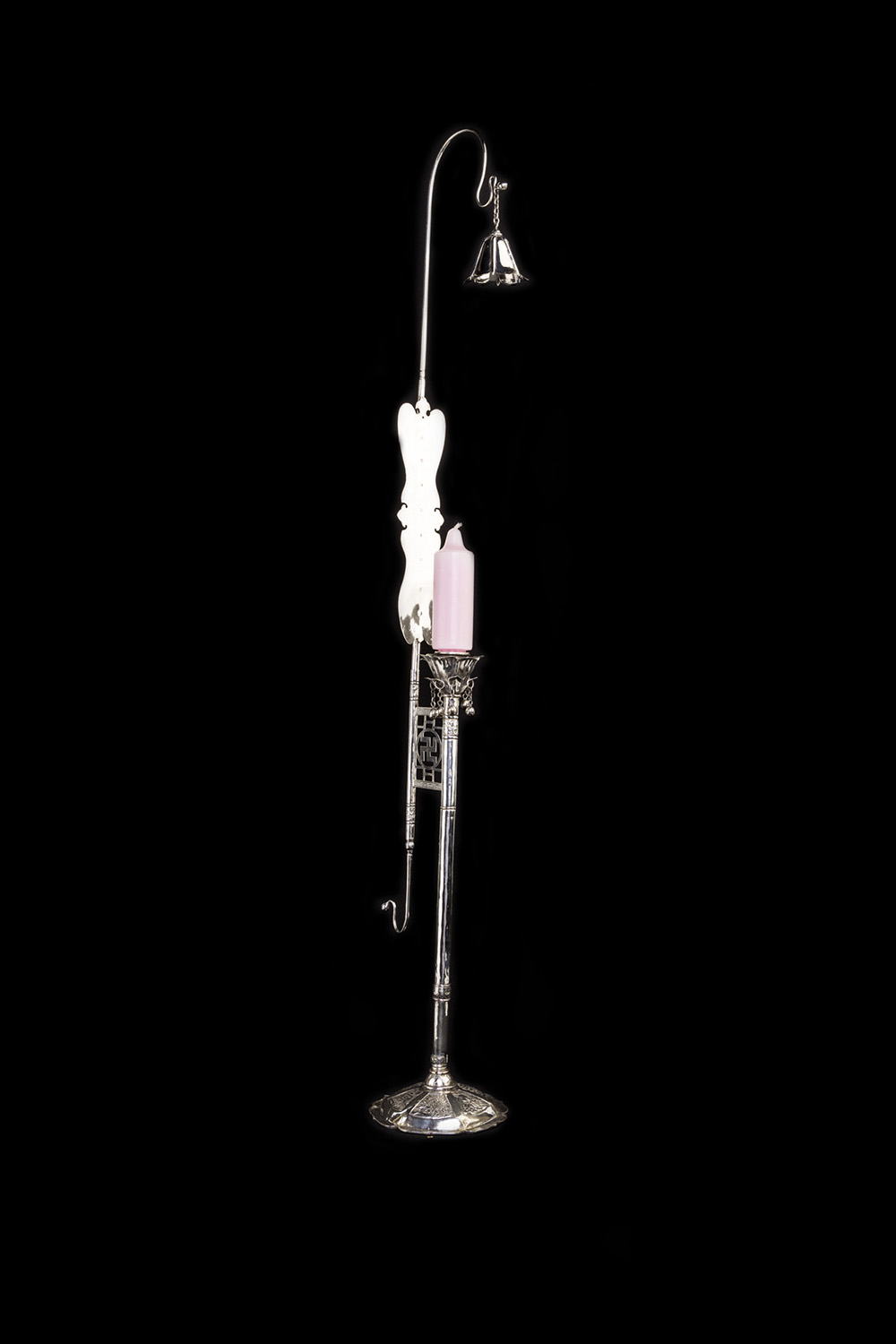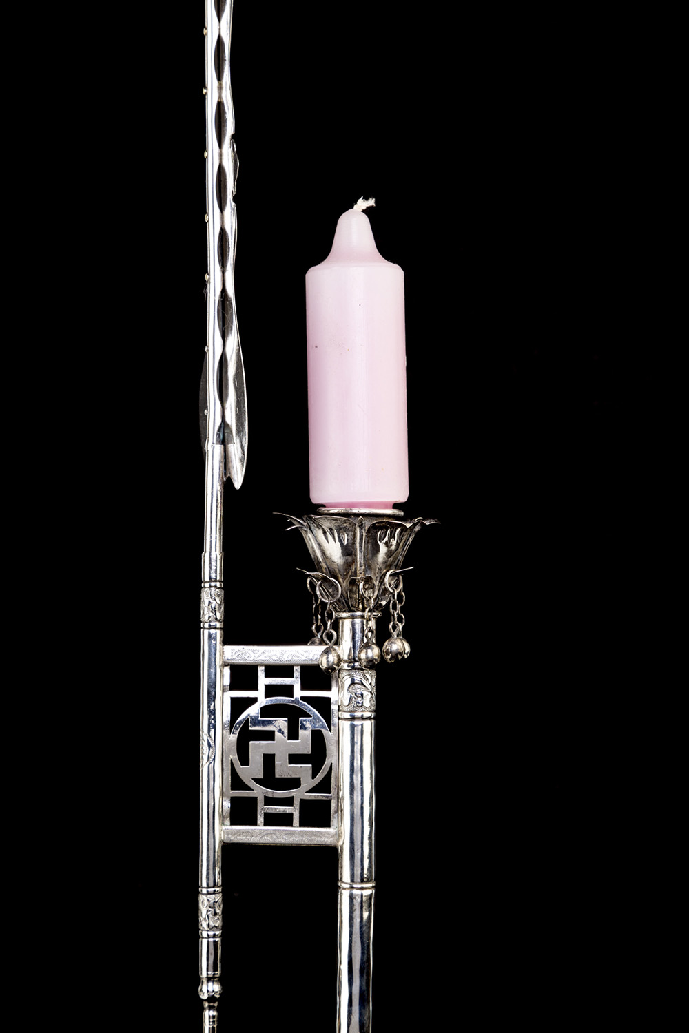 Candelabro in argento con incisioni sulla base. Dinastia Qing. Cm 84x12
