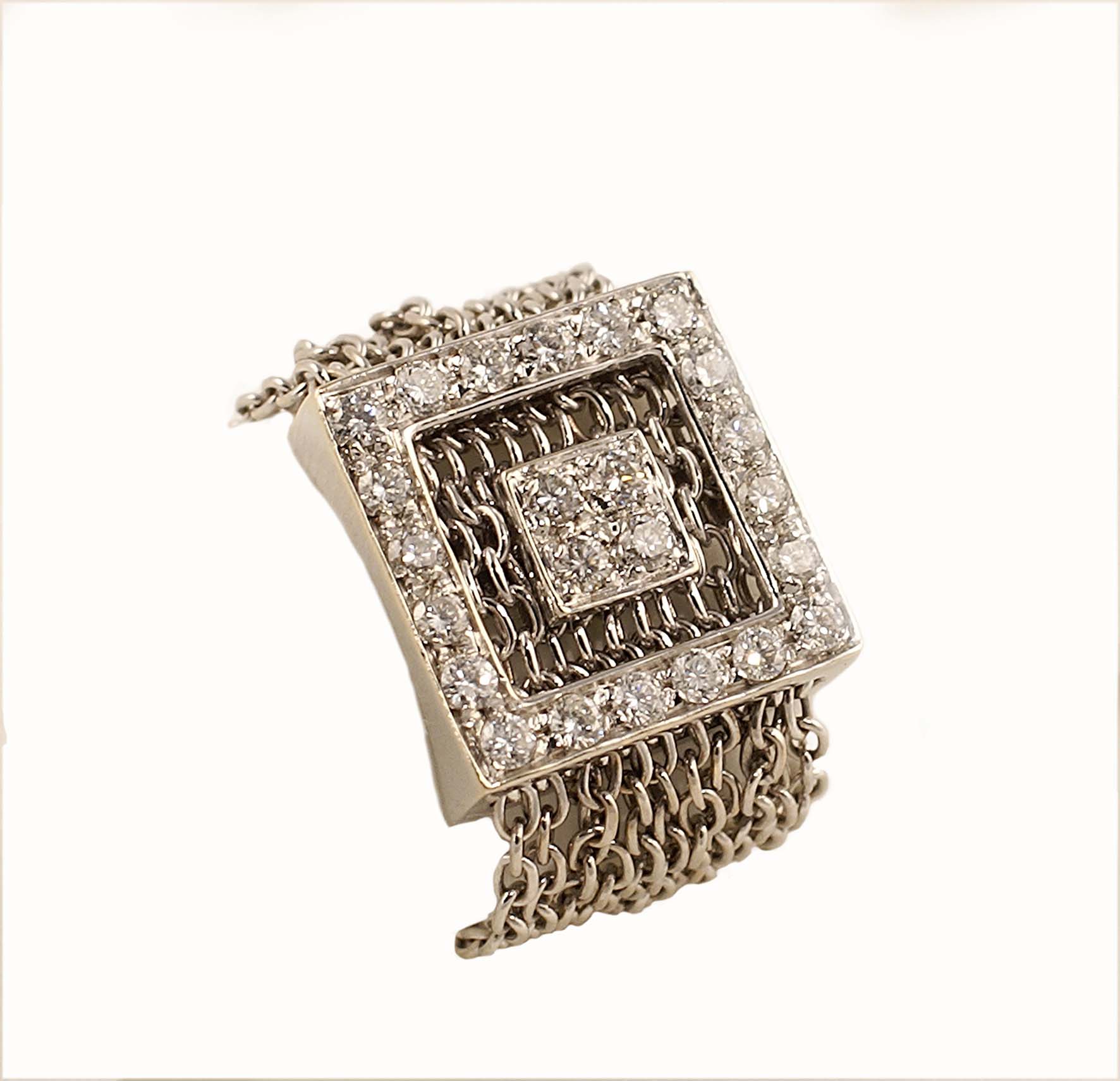 Anello a fascia morbida regolabile in oro bianco 18kt con incastonati diamanti taglio brillante per 0,85 punti circa, gr. 11,1.