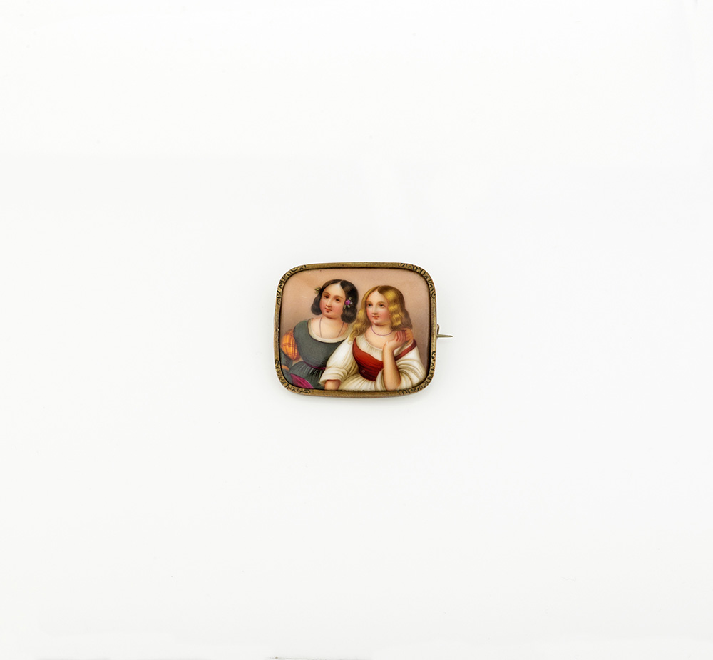 Spilla in metallo dorato con dipinto in miniatura di figure femminili...