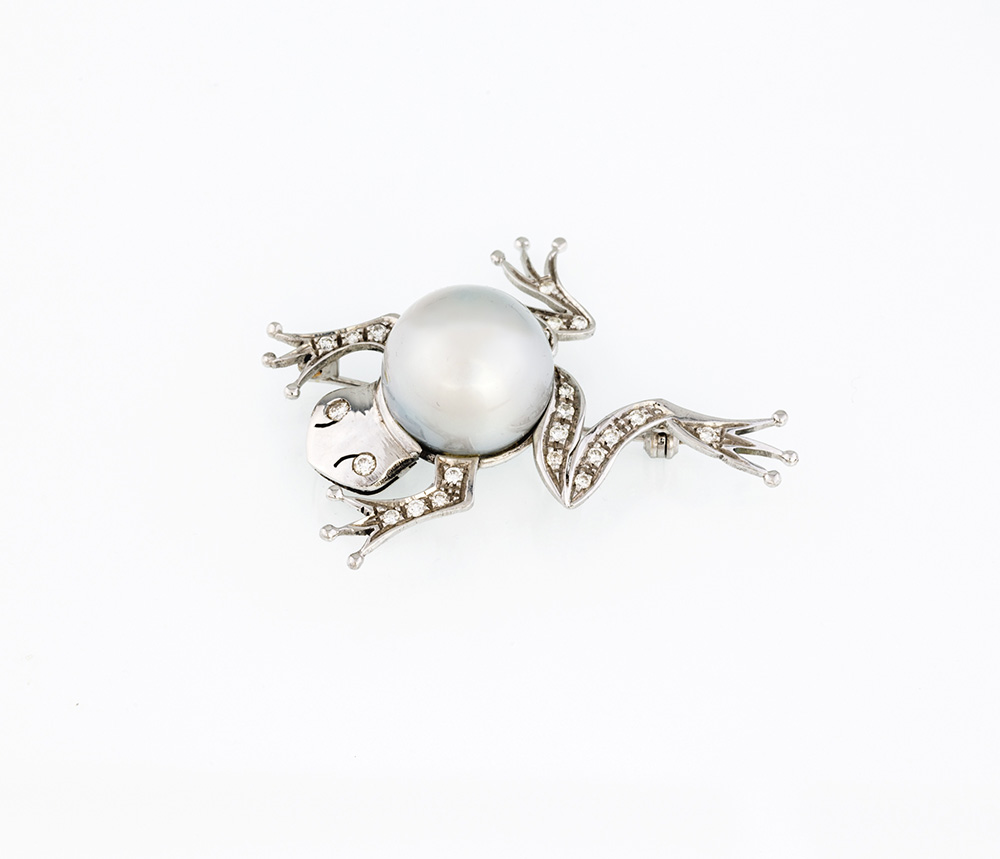 Spilla in oro bianco 18kt a rana con perla australiana mm 15,70 e brillanti g 15,40