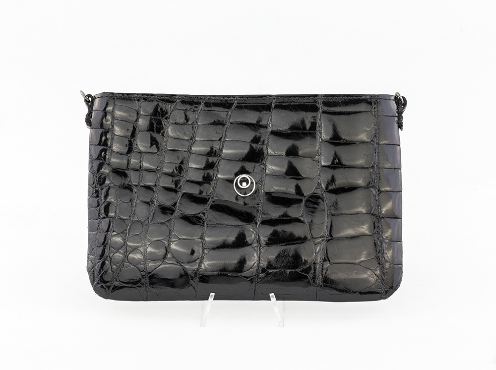 Pochette di coccodrillo nero, con punto luce di gioiello in oro bianco con 23 brillanti ct 0,12 e un brillante ct 0,07, tracolla applicabile. Oggetto nuovo mai indossato.