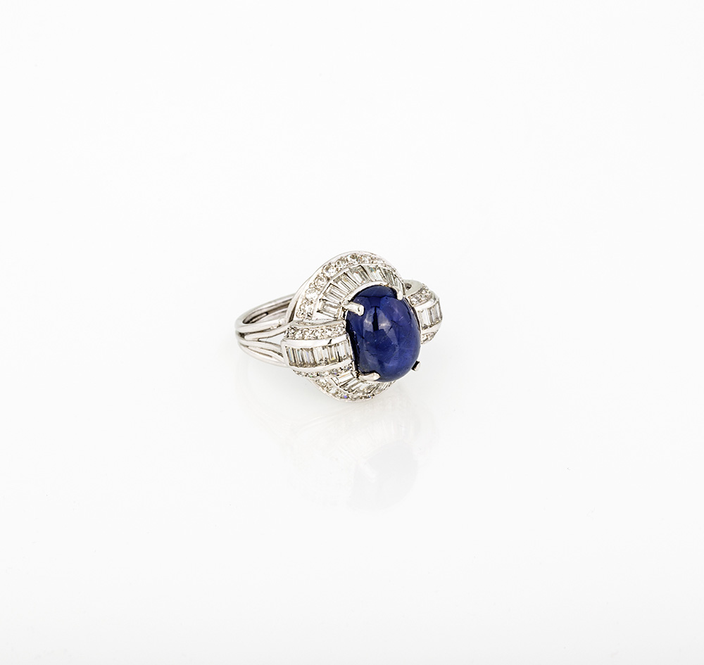 Anello in oro bianco con zaffiro cabochon ct 5,00, montatura con brillanti baguette e huit-huit, g 8,90. Misura 13