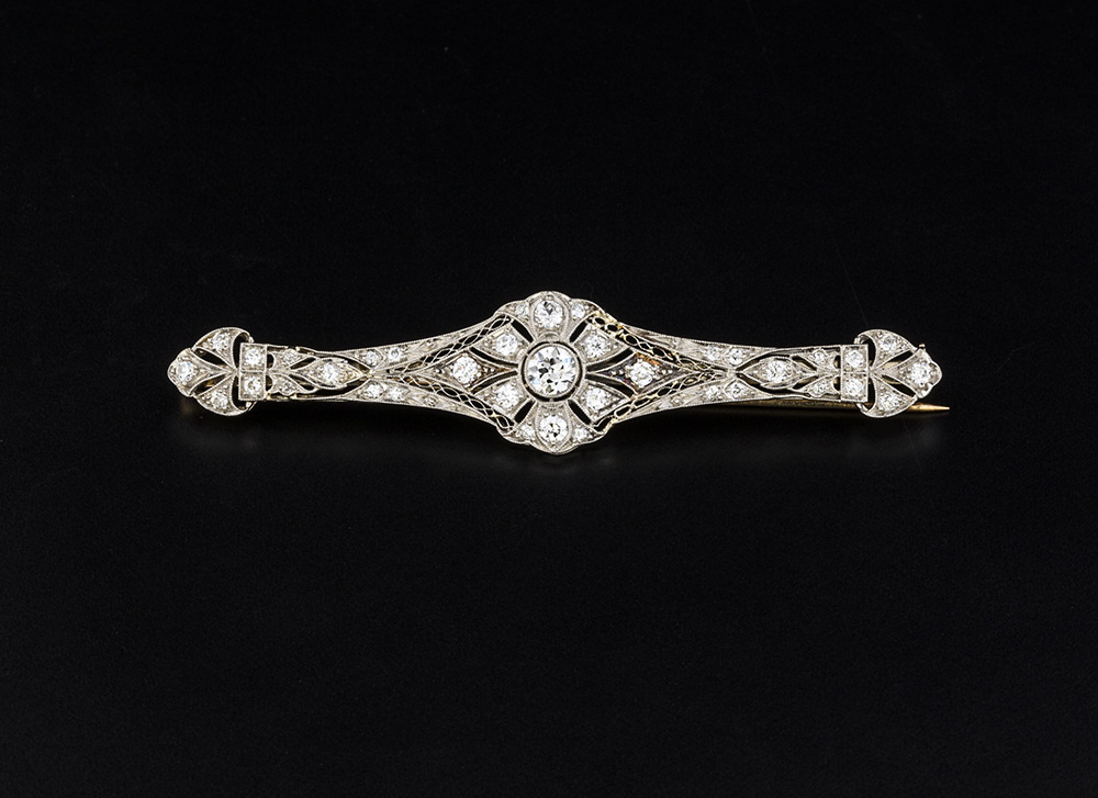 Lotto 583 | Spilla in oro e platino con diamanti taglio vecchio, ct 1,50, inizi XX secolo