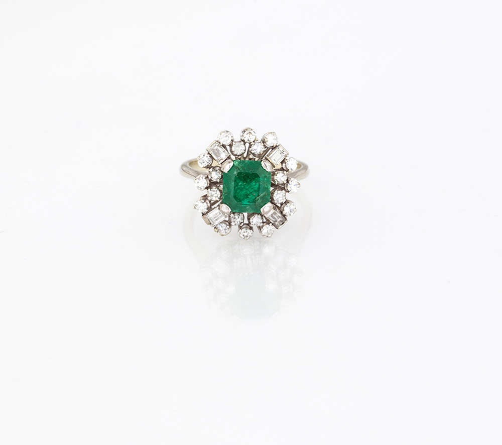 Anello in oro bianco g 4,80 con smeraldo ct 1,50 circa e brillanti ct 0,56 circa.