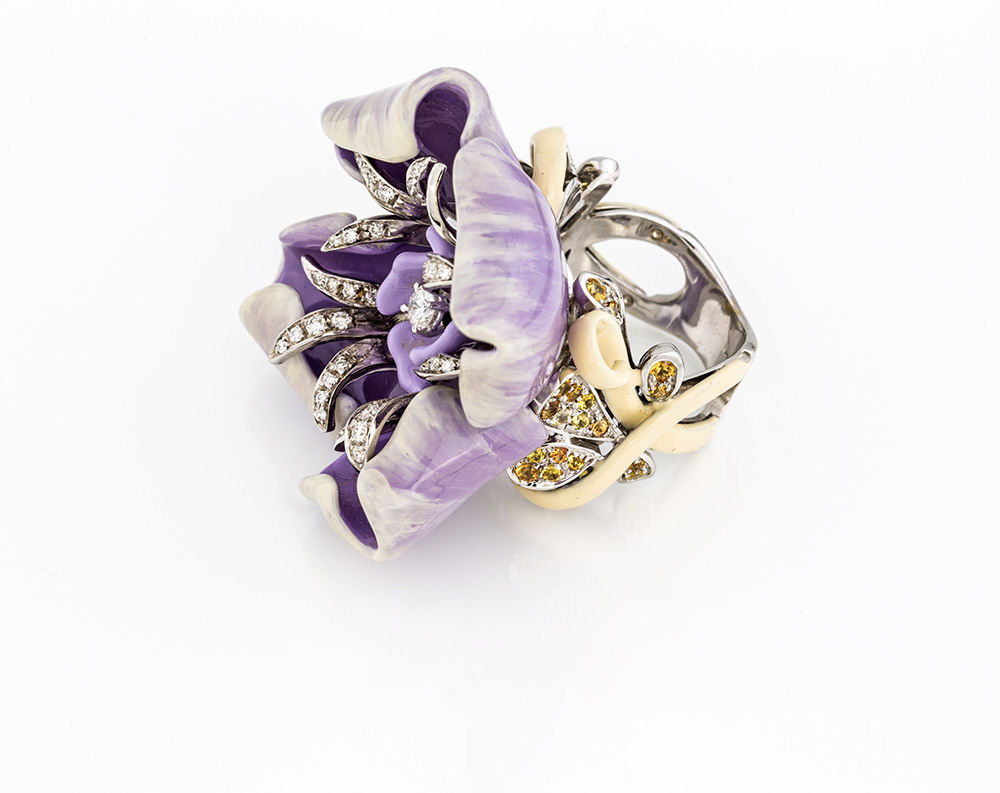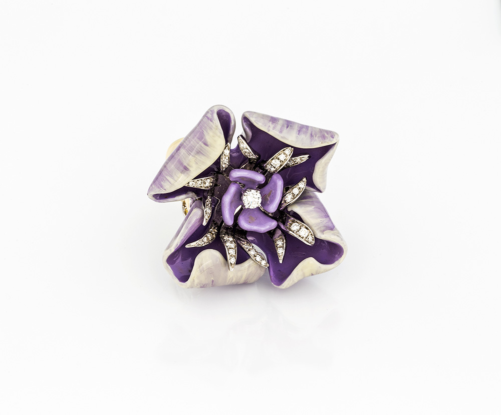 Anello in oro bianco 18kt con brillanti 32/32 con fiore in smalto a caldo e brillanti cognac sul fianco. g 41,00. Misura 17
