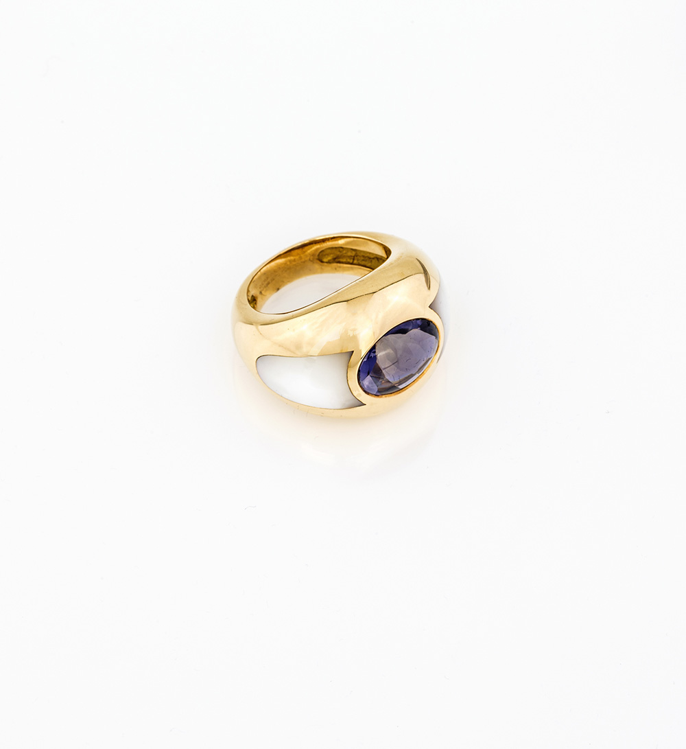 Anello in oro giallo, perle, tanzanite firmato Mauboussin Paris. Misura 9