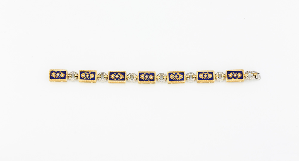 Bracciale oro giallo con motivi incisi su smalti e snodi con brillanti huit-huit, g 46,30