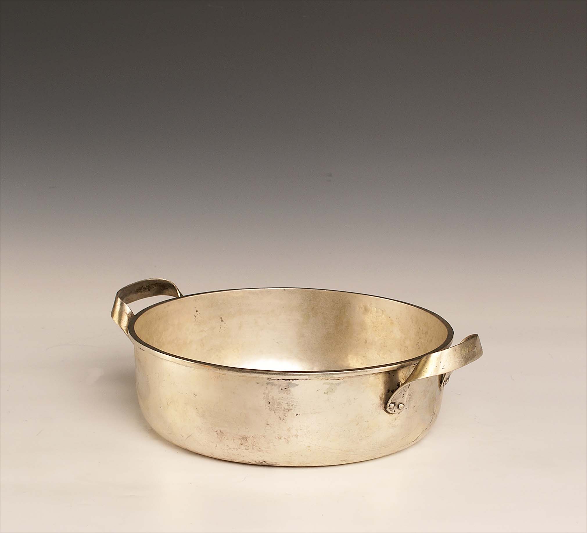 Centrotavola in argento con due manici a corpo liscio, Firenze 1973, orafo Brandimarte, gr. 746, h. cm. 8, d. cm. 23.