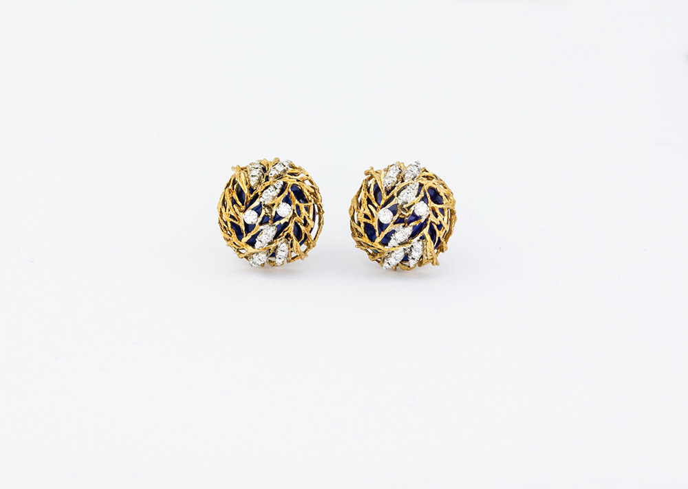 Orecchini oro giallo con ramage e foglie in brillanti su fondello su smalto blu g 30,30