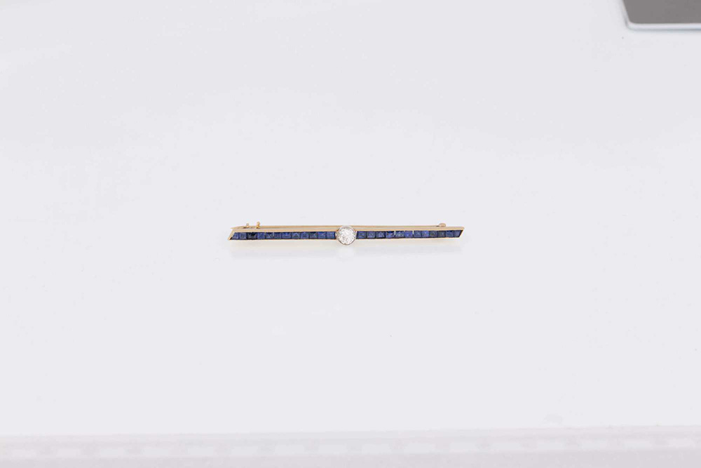 Spilla in oro giallo anni '30 con zaffiri baguette di buon colore e brillantezza e diamante taglio vecchio ct 0,60 circa.