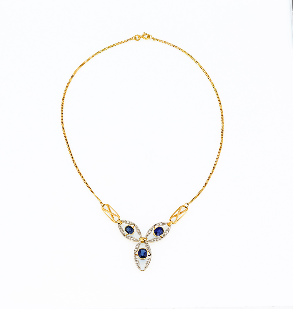 Girocollo in oro giallo 18 kt con tre zaffiri ct.2,40 circa e rose di diamante, totale g 13,50, lunghezza cm 41