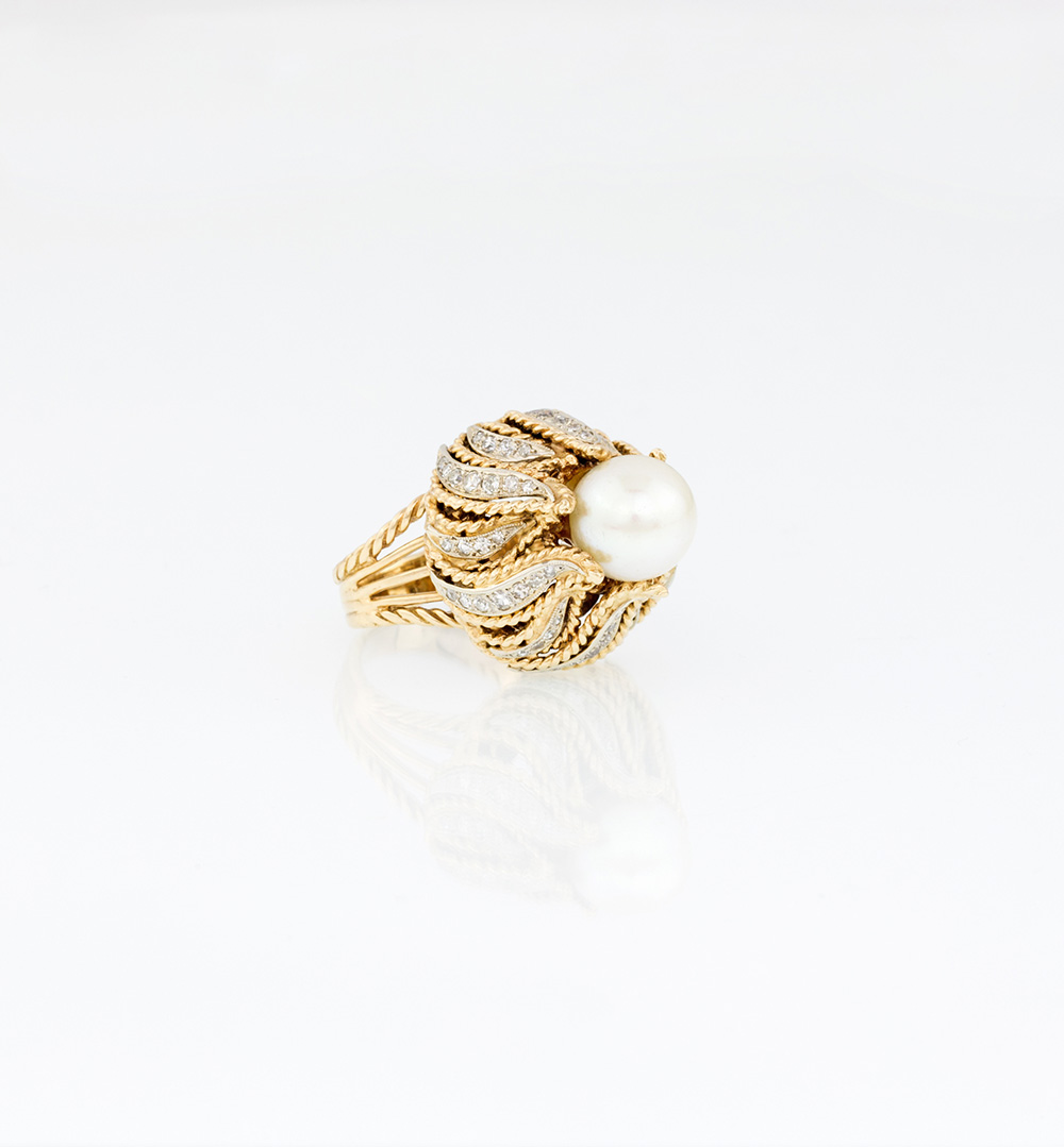 Anello in oro bianco e giallo anni '40 diamanti ct 0,80 e perla coltivata