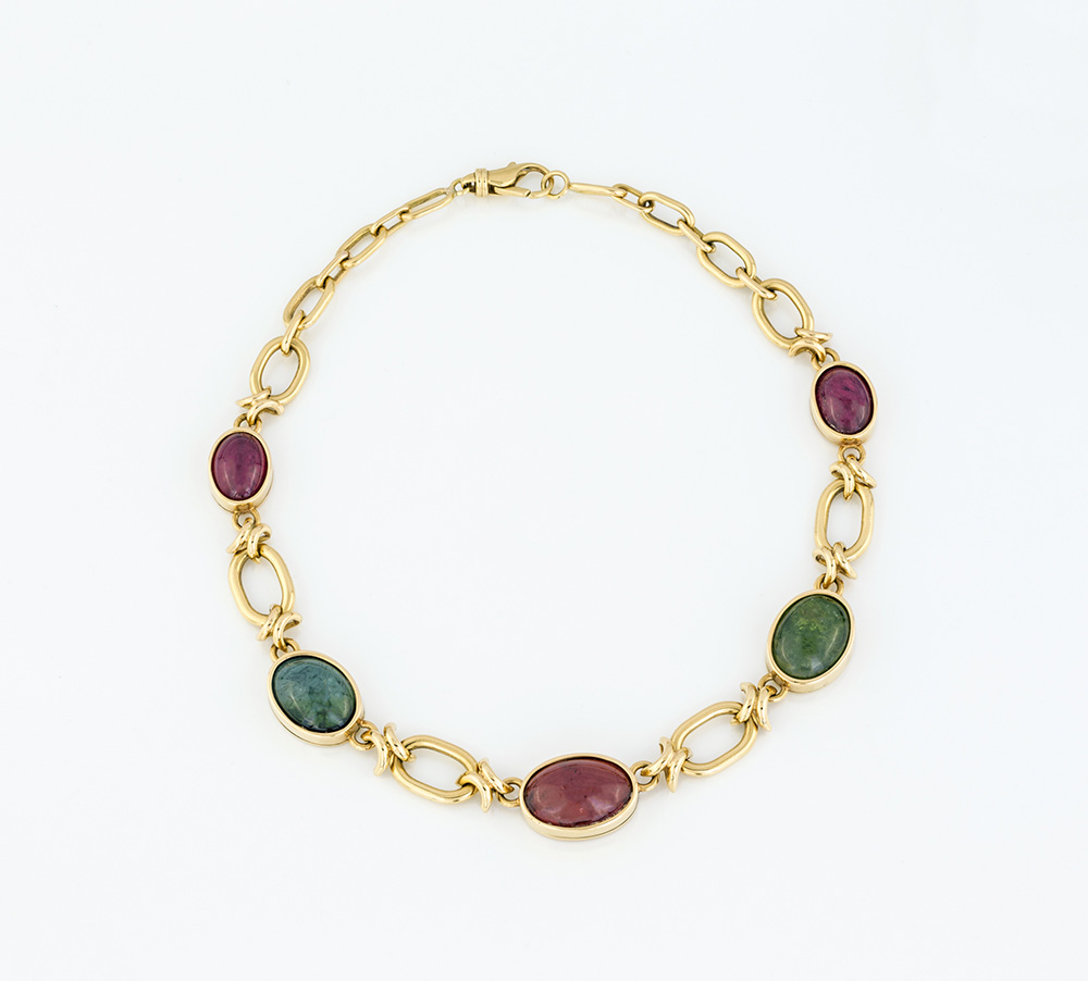 Lotto 718 | Catena in oro giallo con tormaline cabochon, ct 40, peso totale oro g 88