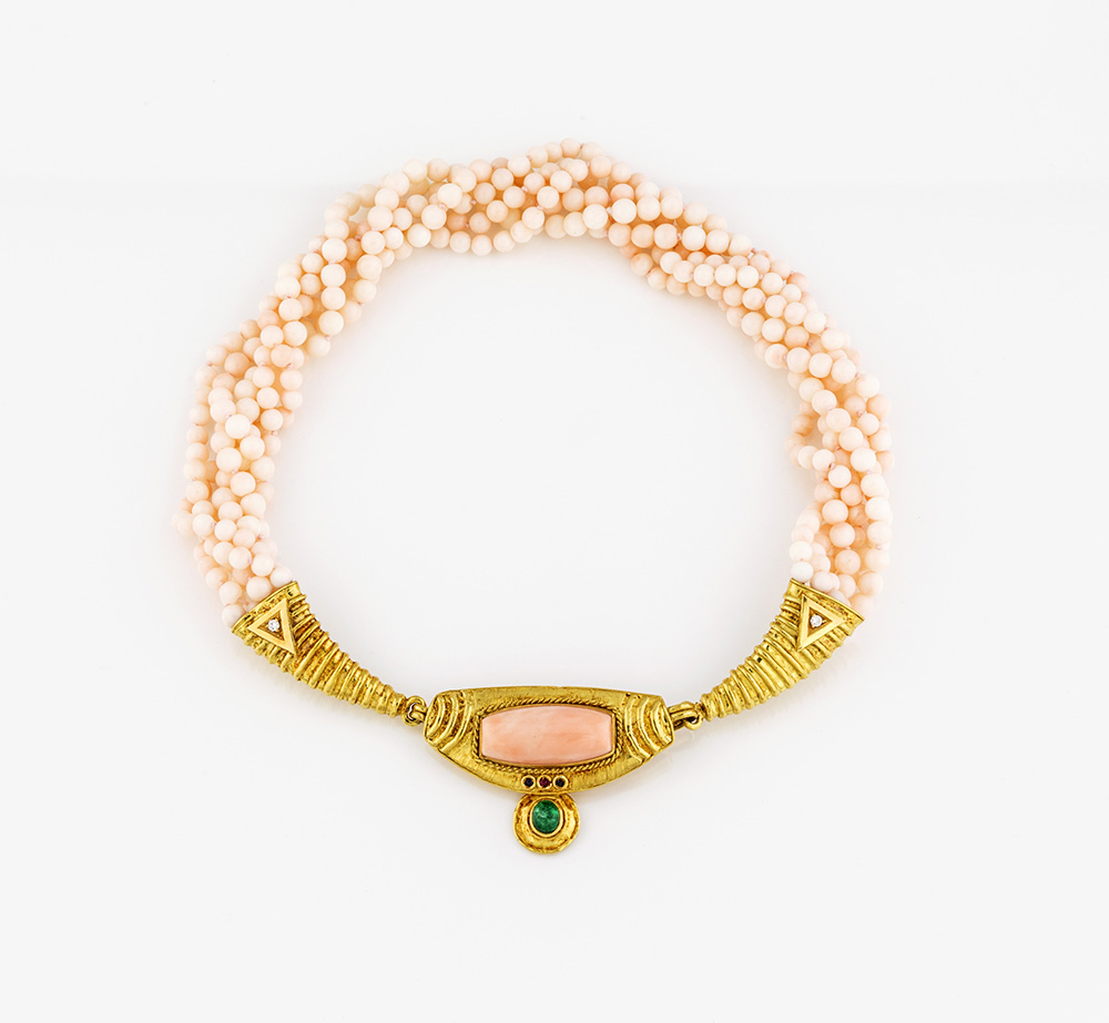 Torchon con fili di corallo rosa con centro in oro 18 kt, grande spola di corallo rosa e un cabochon di smeraldo, g 90 totali