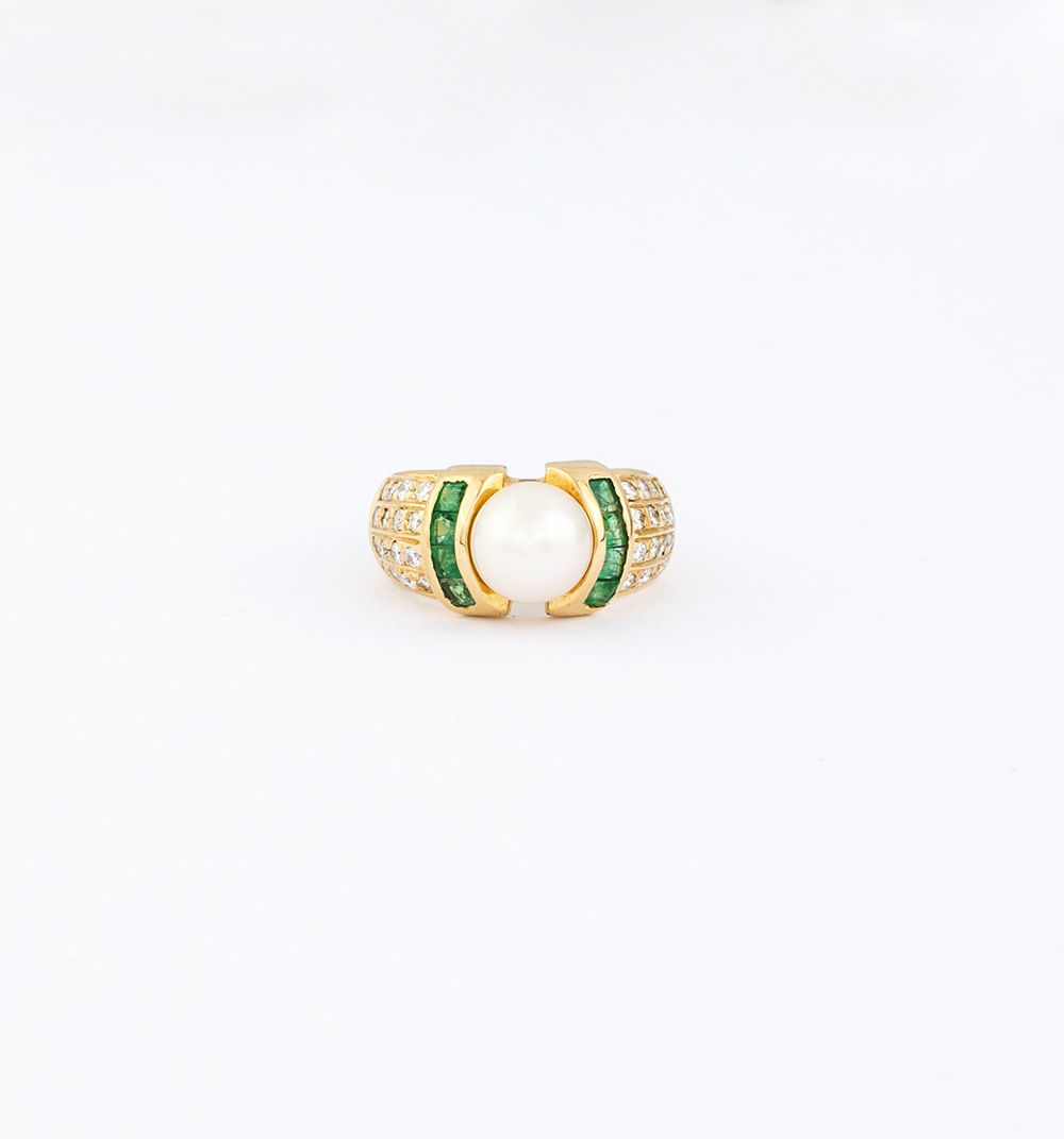 Anello in oro giallo 18 kt con 8 smeraldi carrè ct 0,40 e 32 brillanti ct 0,50, g 12,20