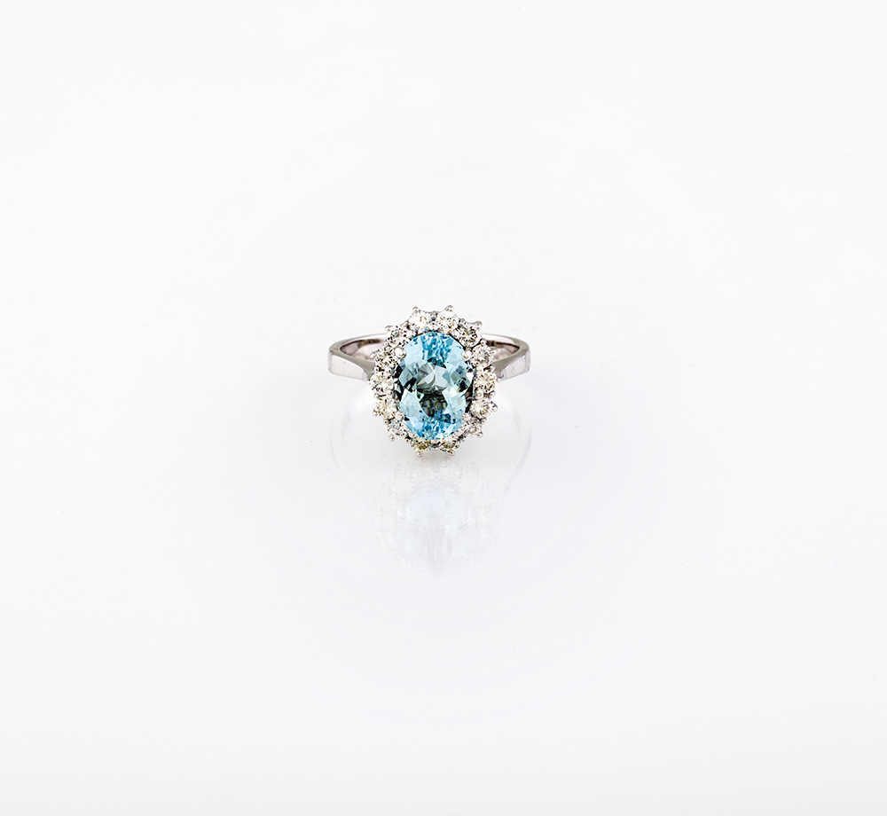 Anello oro bianco con brillanti ct 0,50 ct e acquamarina ct 3,00 circa g...