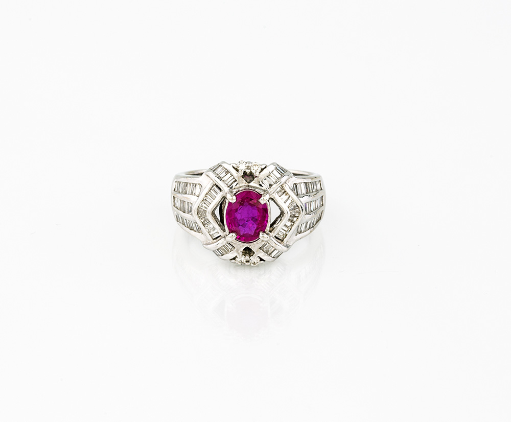 Anello con rubino rosso vivido, ct 1,70 circa e brillanti ct 2,00 circa g 7,60. Misura 13.