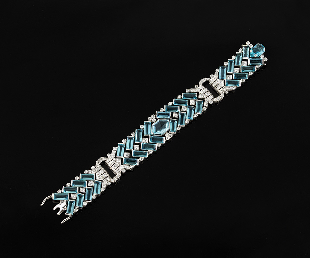 Bracciale in oro bianco con brillanti e pietre azzurre sintetiche, g 45,05.