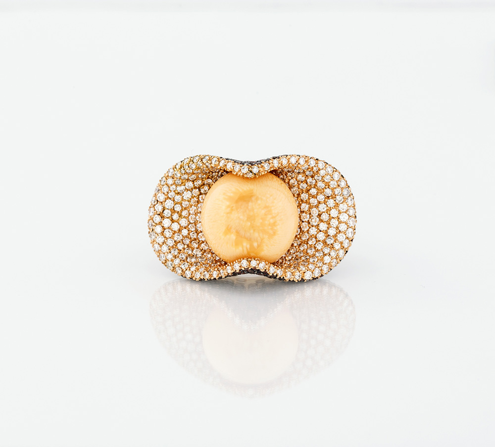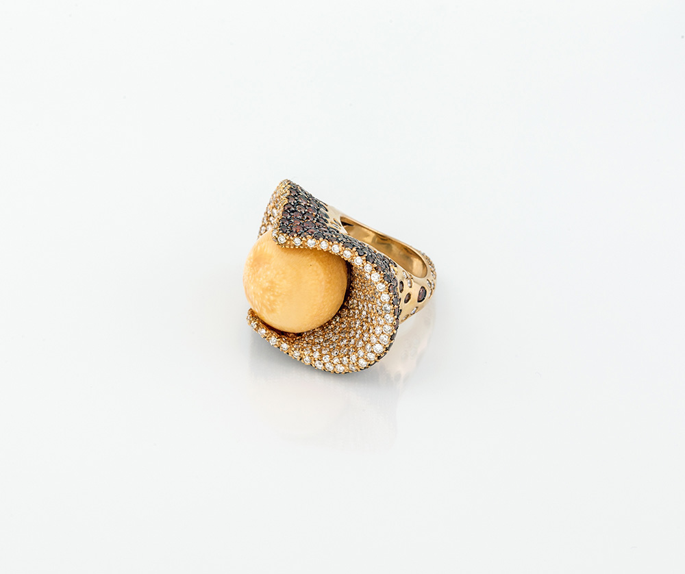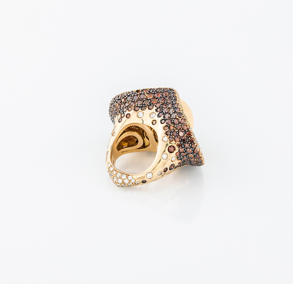 Anello con perla melo naturale ct 54,45 montata in oro rosa 18 kt, diamanti colore brown ct 7,26 e brillanti ct 6,00, peso totale g 58,50.Misura 14. Certificato CISGEM n. 65387 del 26/07/11. La perla Melo è unica, rara ed esclusiva. La struttura a chiocciola della conchiglia è formata da ampie spirali che creano un naturale ed ampio spazio dove la perla può essere libera di formarsi senza incontrare ostacoli che potrebbero variarne la sfericità. Flamage è il termine usato per indicare il gioco di luce che si crea sulla superficie della perla quando la si muove. Oggi, si conoscono circa ottanta perle Melo in tutto il mondo.