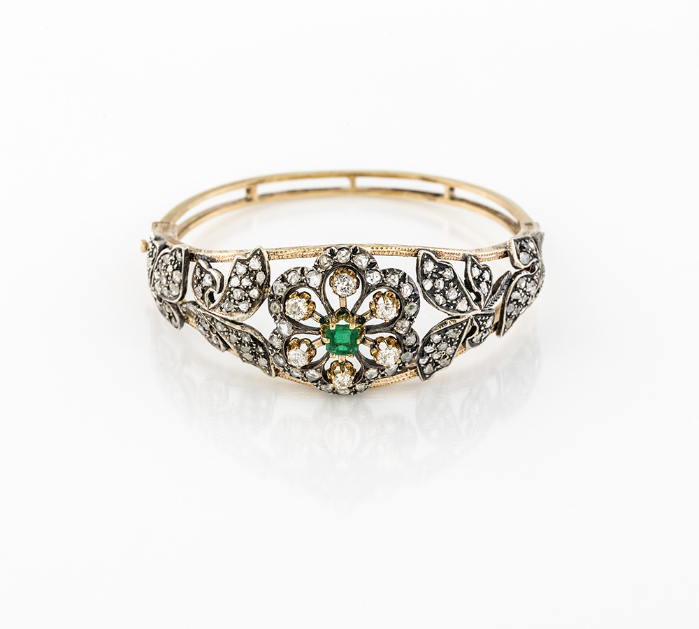 Bracciale in oro giallo con apertura a cerniera, al centro un fiore di 6 brillanti e 1 smeraldo. Le foglie sono rese a pavè con rose di diamanti, g 32,40.