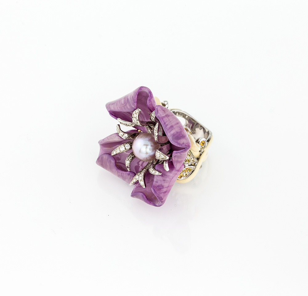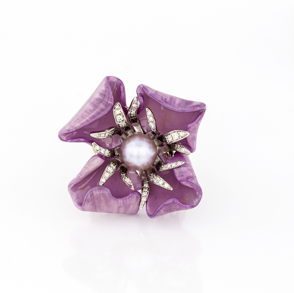 Anello in oro bianco con fiore lilla in smalto, perla rosa freshwater e brillanti, g 43,70. Misura 17.