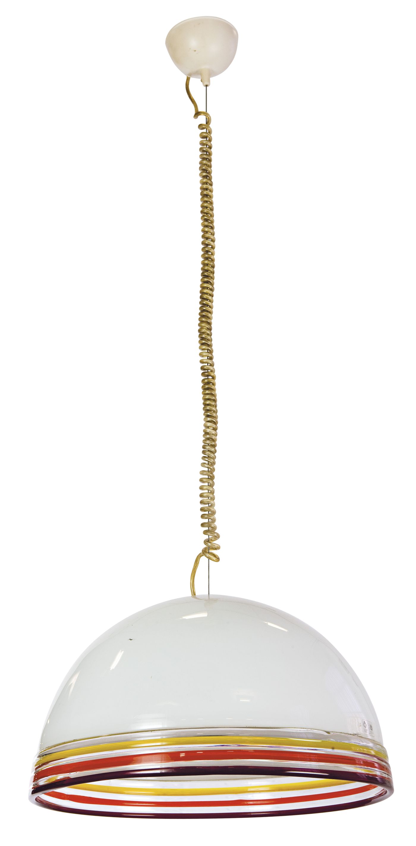 TOSO RENATO – Febo, Lampada con diffusore in vetro soffiato e aperto a mano volante. Prod. Leucos 1975. Bordo multiplo di colori diversi a grossi fili buttati a caldo. Versione a sospensione e a parete. Diam. cm 43. Bibl.: Catalogo di produzione disponibile in copia.