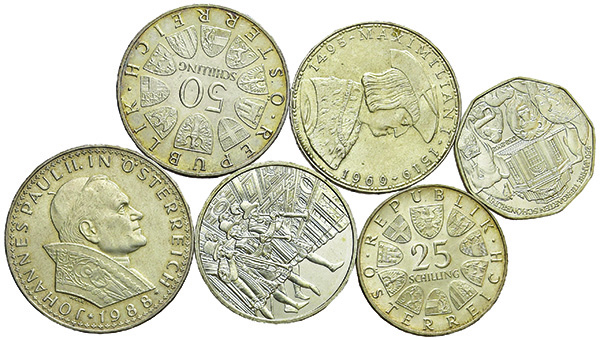 AUSTRIA. Lotto di sei monete in argento: 500 scellini 1988; 50 scellini 1965...