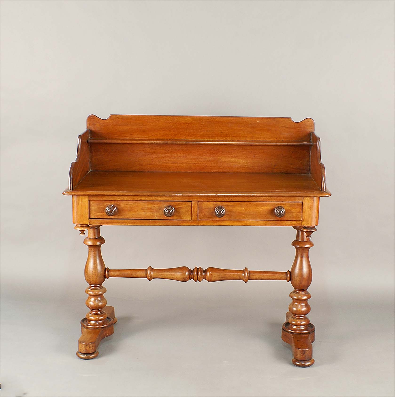 Scrittoio in mogano, piano rettangolare con due cassetti sottostanti, poggiante su gambe tornite e riunite al centro, Inghilterra, vecchia manifattura, cm. 100x108x53.