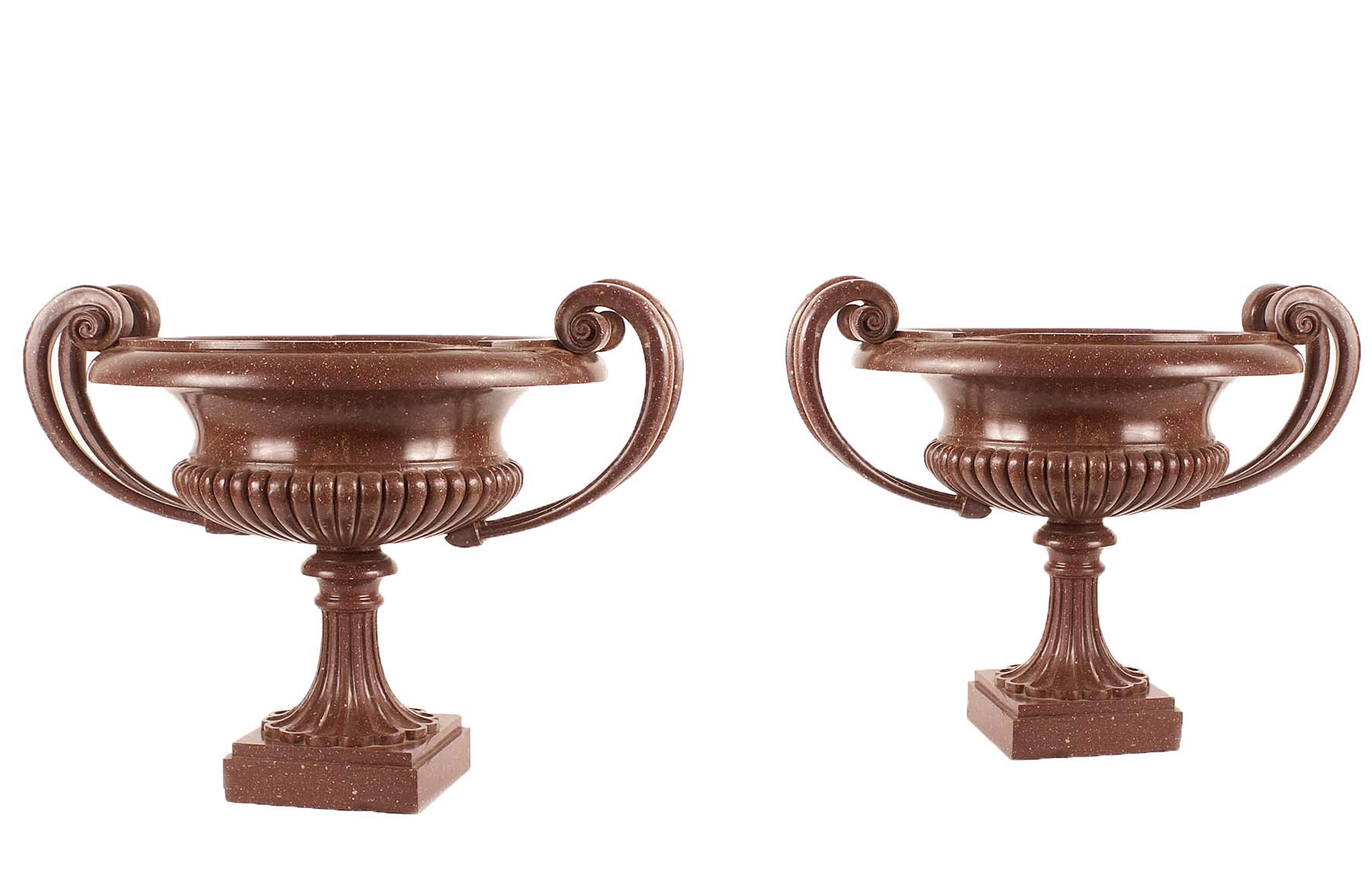 Coppia di grandi vasi in porfido con manici a voluta, baccellati sul corpo e...