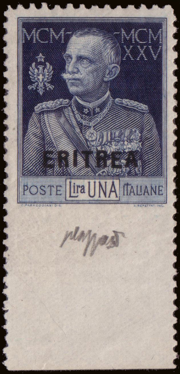 [ERITREA] 1925 "Giubileo del Re", 1 lira azzurro D.11, varietà non dentellato in basso. Cert. E. Caffaz. Firma A. Diena MNH..........(Sass. 97a)